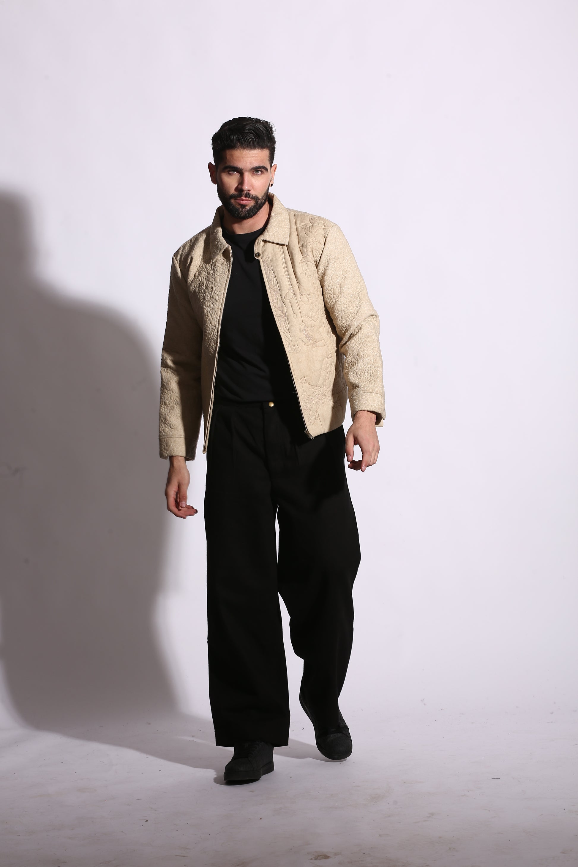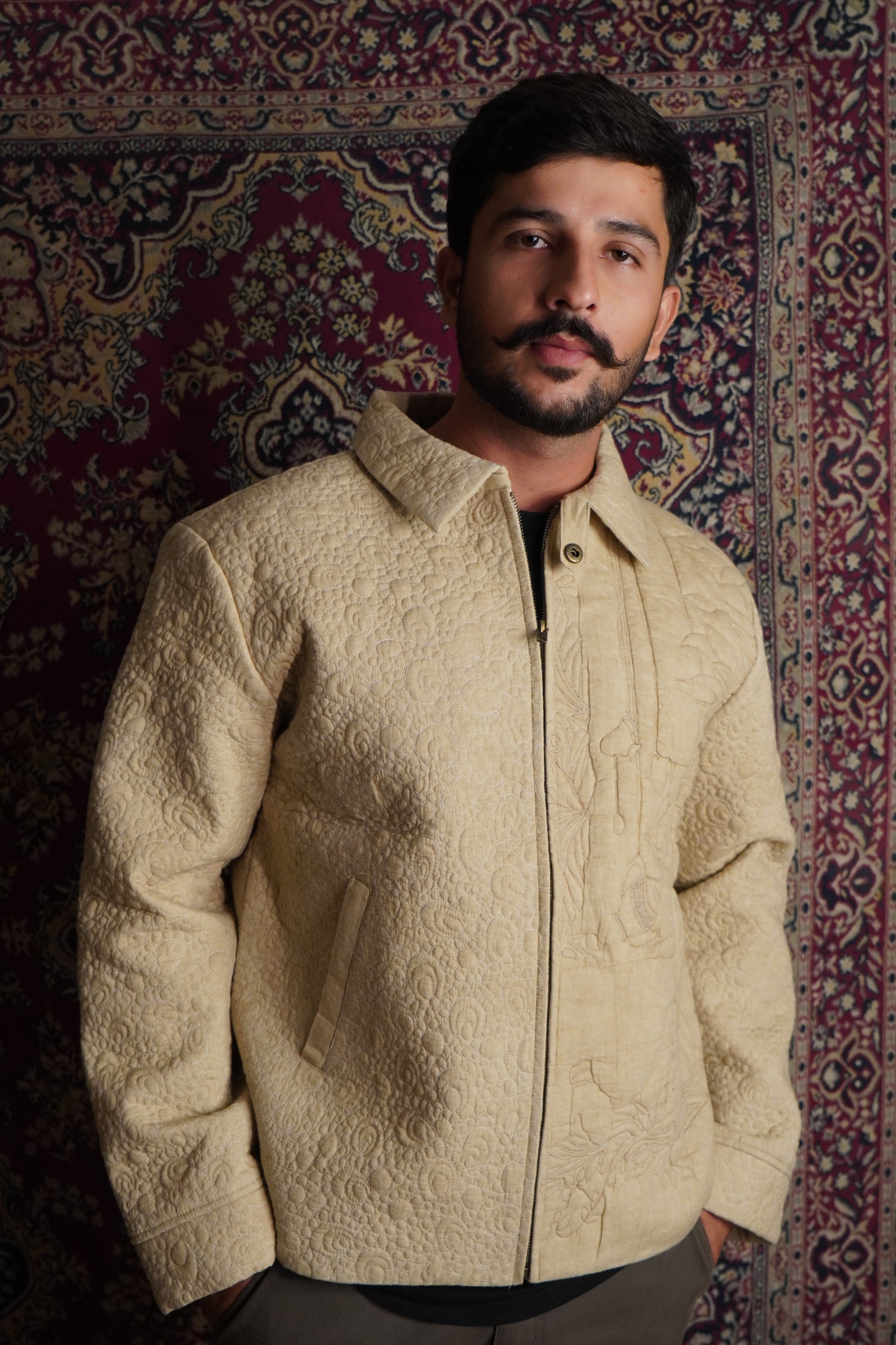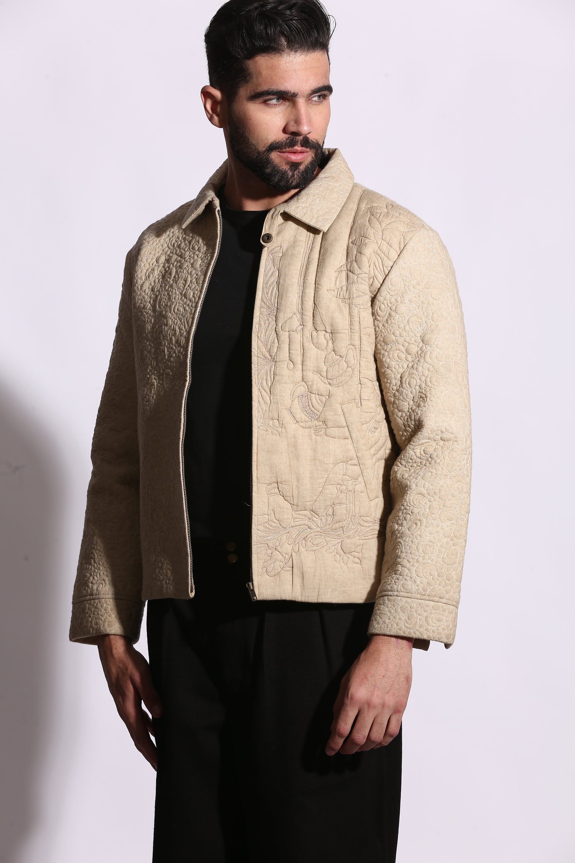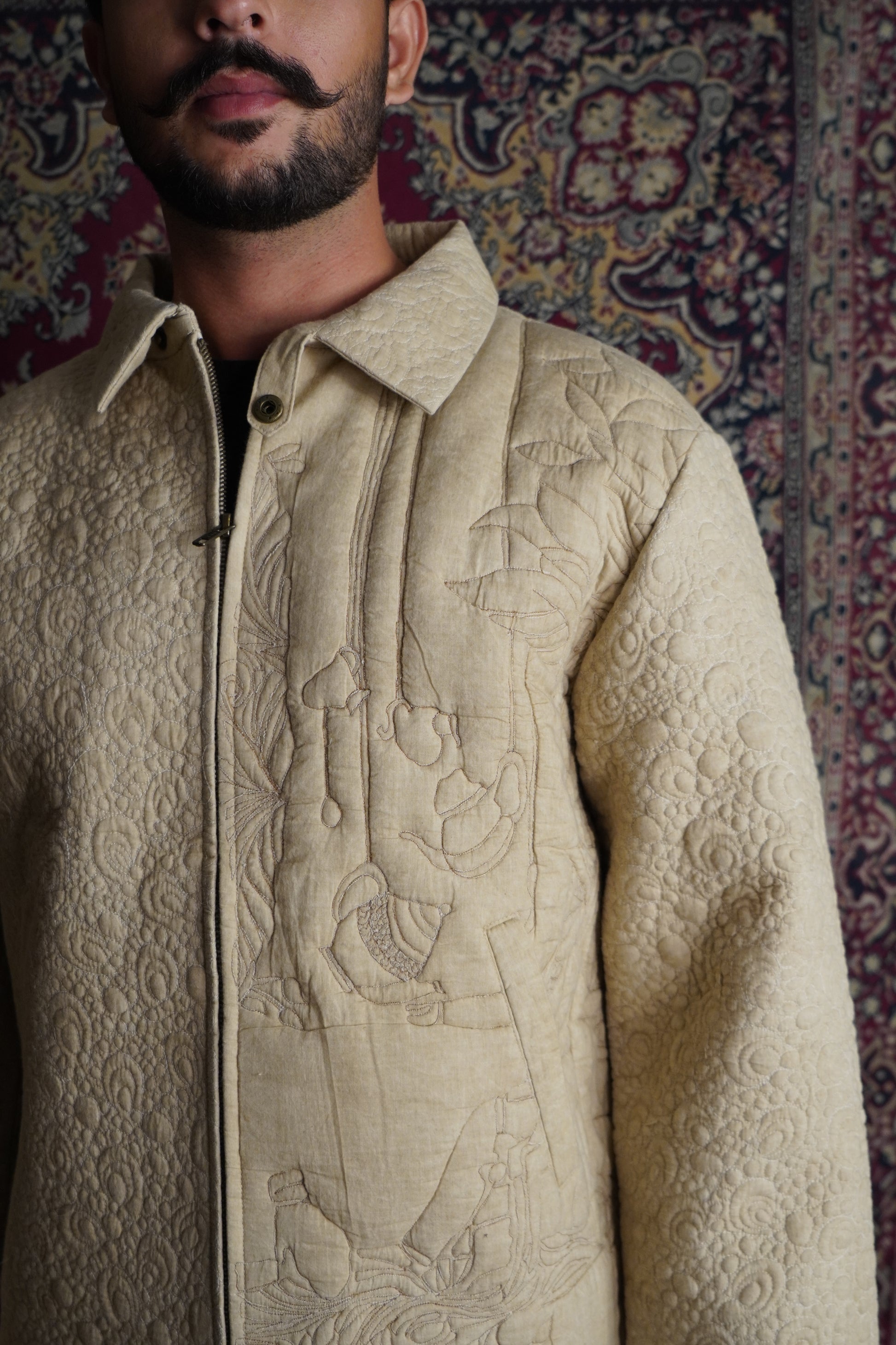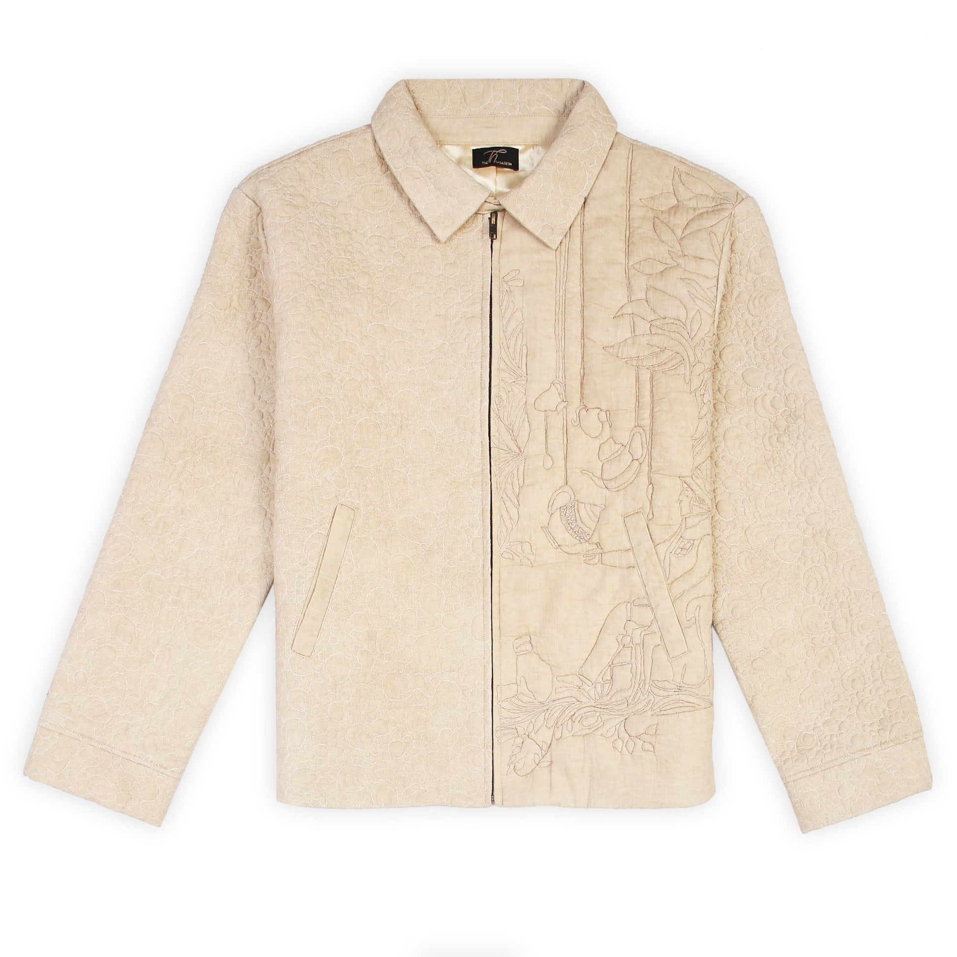 Drew Unisex Coach 3D Embroidered Quilted Jacket is crafted from soft Cotton features a front zipper along with convenient side pockets. Inspired from my Last Visit to Texas I am very fond of Visiting Quilt Museum which inspire me for vintage Workmanship this jacket is a master piece from the Inspiration I got from Quilt Hanging from Texas Quilt Museum the master piece of 3d Stitching Artwork adds a refined touch to the design. Ideal for layering, this jacket offers warmth and a contemporary look, making it a versatile addition to your wardrobe.